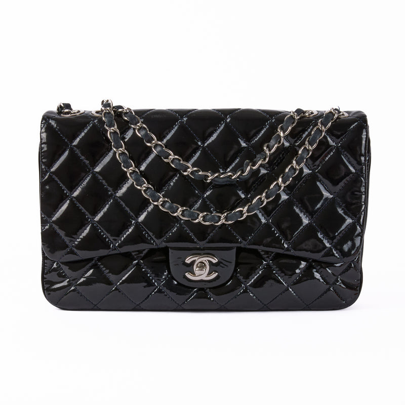 CHANEL - Sac bandoulière Timeless Simple rabat 3 Goussets cuir vernis bleu - Hand bag